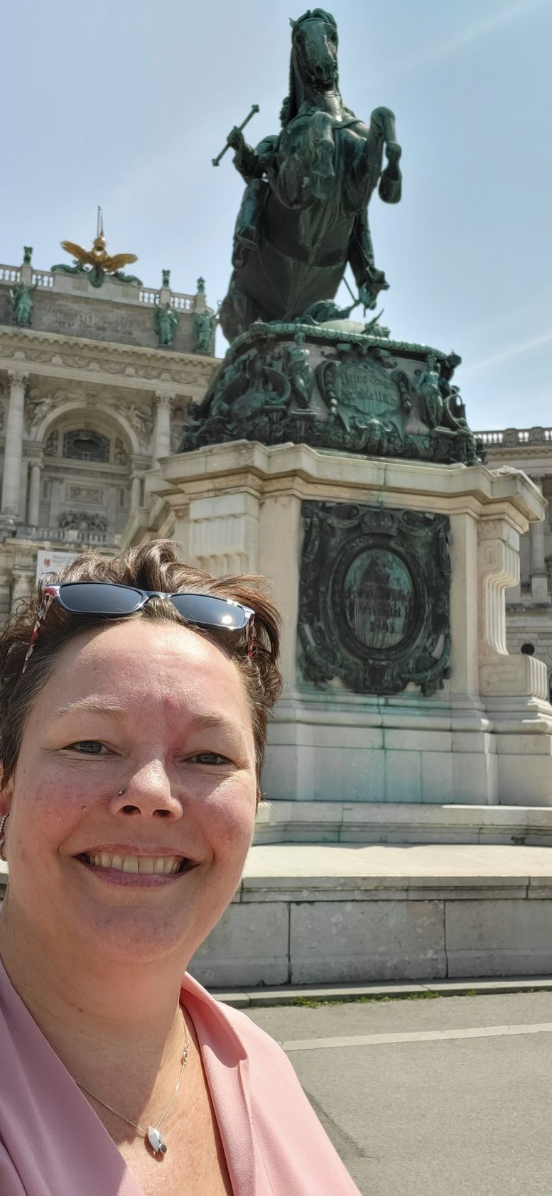 Toen ik het museum uit kwam wilde ik meteen de Volksgarten die in in de ochtend al had gezien eens gaan bekijken. Ik moet eerlijk zijn dat dat me een beetje tegen viel, ik had verwacht dat het groter zou zijn. Ik had een soort St. James' park in mijn hoofd en dat was het totaal niet. En dus ging ik meteen het park ook weer uit en liep richting..... Hofburg! Heel bijzonder om dat nu in het echt te zien, ik ken het alleen maar uit de series over Sisi. Ook nu was ik verwonderd over de pracht en praal en de grootsheid van het paleis en het gigántische beeld dat ervoor staat.