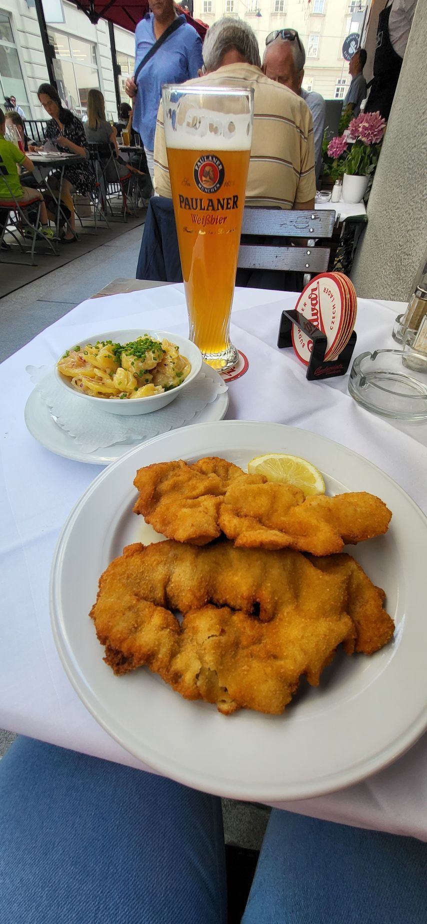 Gewapend met mijn elektronische wegvoorzegger ging ik op weg naar het metrostation om bij de Stephansdom weer uit te stappen. Ik ben ik de kathedraal geweest maar heb er niet heel veel kunnen zien. Om meer te zien moest ik flink in de buidel tasten en nou mag mijn vakantie wat kosten, ik heb er immers hard genoeg voor gewerkt, maar in dit geval had ik het er niet voor over. Ik liep dus een rondje om de kathedraal, zag een bordje dat me naar het Mozarthaus wees (ik denk dat ik dáár toch maar wel heen ga, het was nu helaas gesloten) en kwam een restaurantje tegen waar ze Oostenrijkse kost serveerden. Na een dag lang de toerist uithangen vond ik dat het wel tijd was voor een warme maaltijd, dus streek ik neer op het terras, zette mijn principes een keer opzij en bestelde een overheerlijke Wiener Schnitzel met kartoffelsalat en een groot glas bier. Ein prosit!