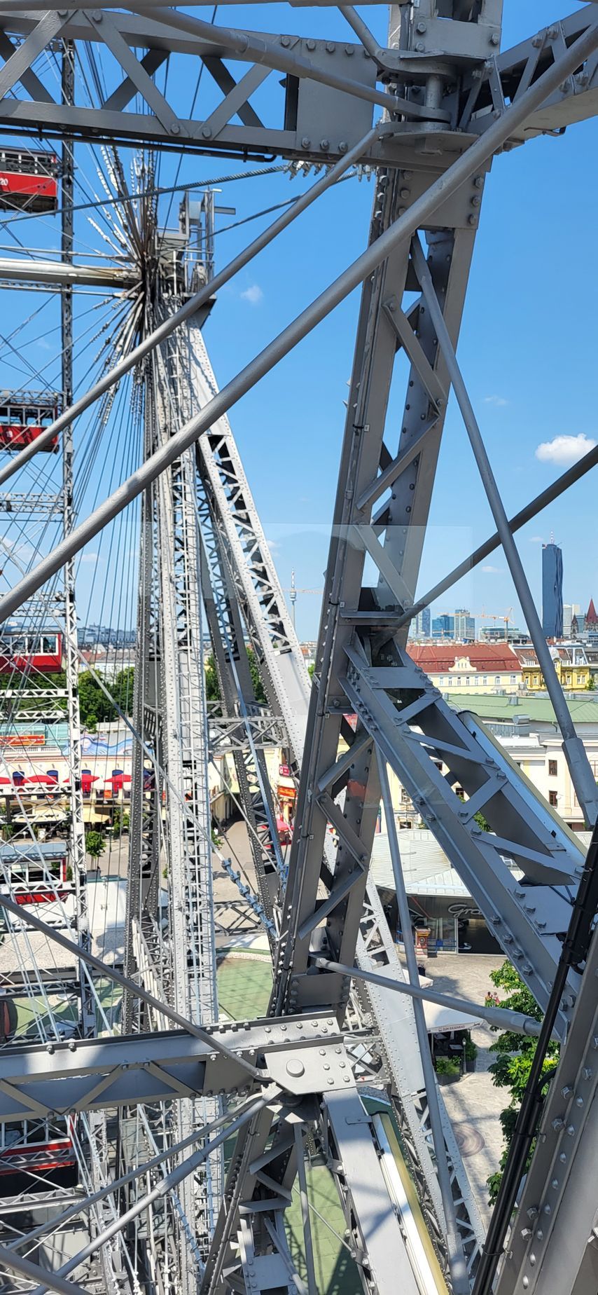 Ik wist van het bestaan van dit park door het boek dat ik begin dit jaar las. Al was het toen nog echt een park en nu is een flink deel pretpark. In dat boek, dat zich begin 1900 afspeelde, bestond dit reuzenrad wel al. Zowel het Prater als het reuzenrad wilde ik wel zien. Het 69 meter hoge rad staat er al sinds 1897 en draait nog steeds. Zodra ik het park in liep wist ik, hier wil ik in. Maar ik heb wel hoogtevrees, dus of het een goed idee zou zijn waagde ik te betwijfelen.